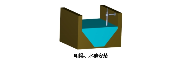 明渠、水池安装时,需配一个支架,将其固定在池壁上。支架需根据现场具体情况设计。